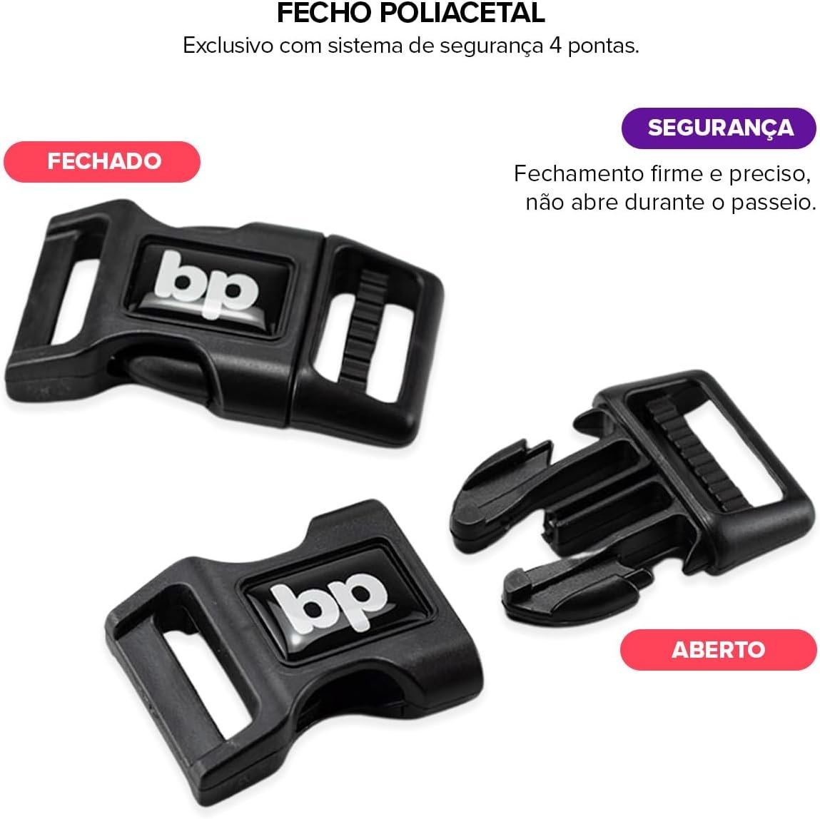 Fecho seguro e confiável: Fecho em poliacetal reforçado, evita aberturas indesejadas durante o passeio.