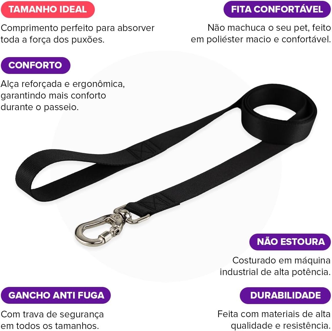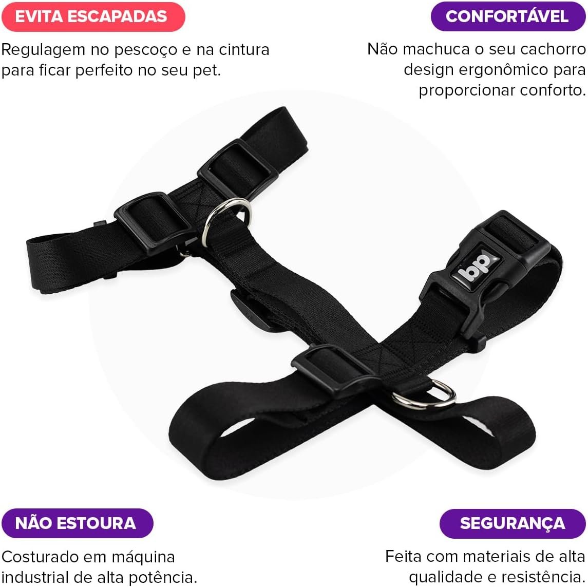 Controle total do seu pet: Argolas metálicas reforçadas para prender a guia com segurança.