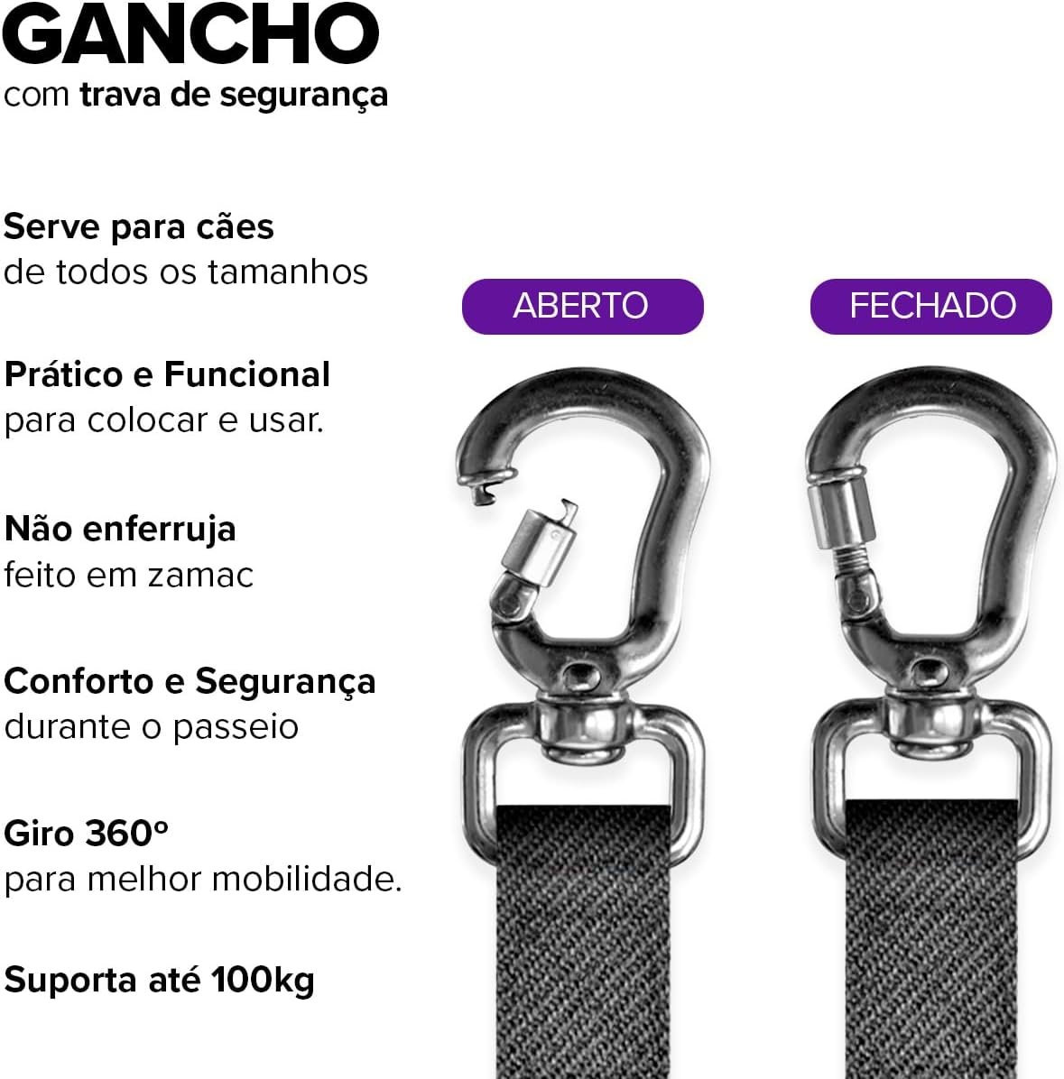 Trava de Segurança: Gancho com trava de segurança disponível para todos os tamanhos.