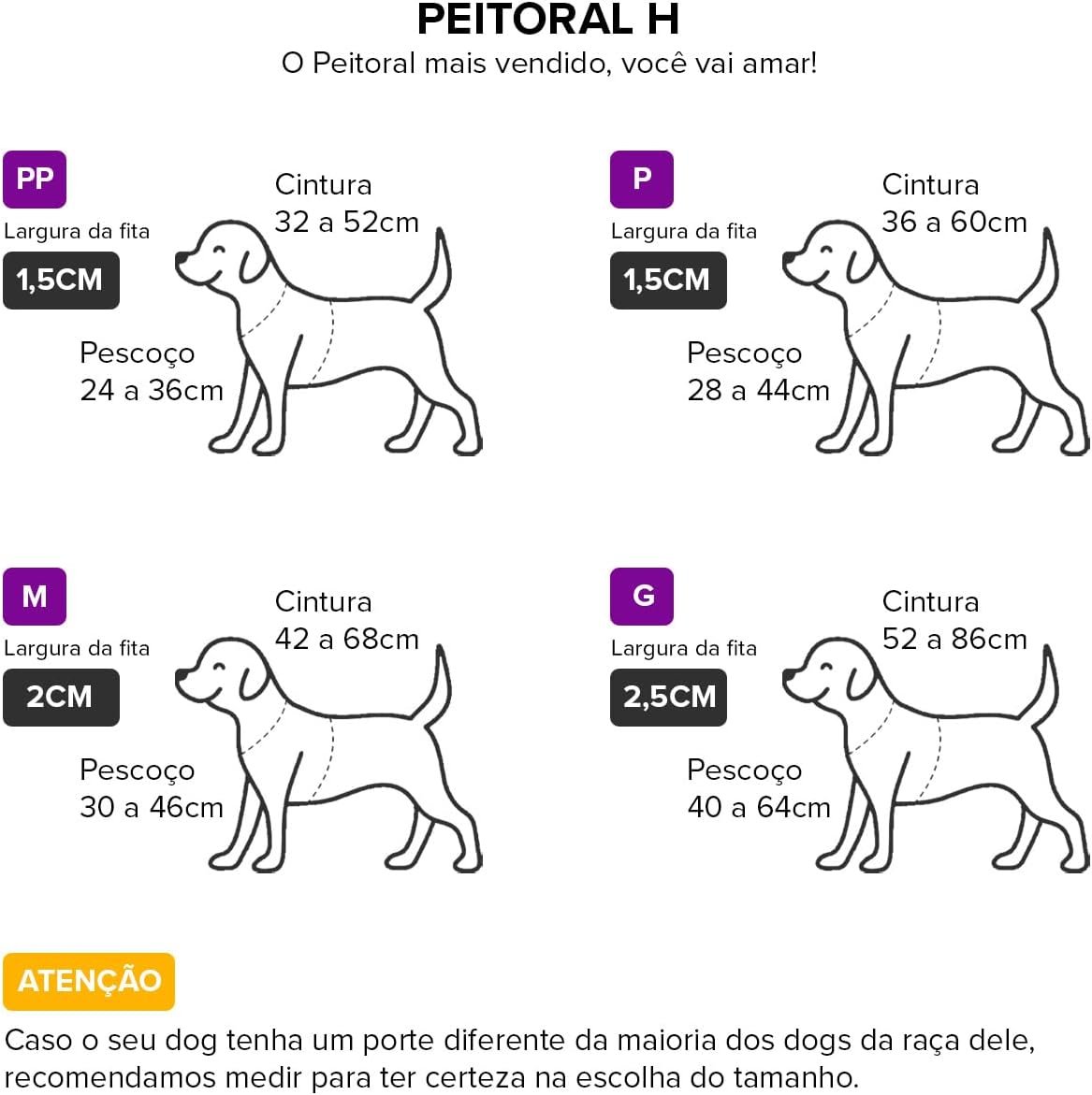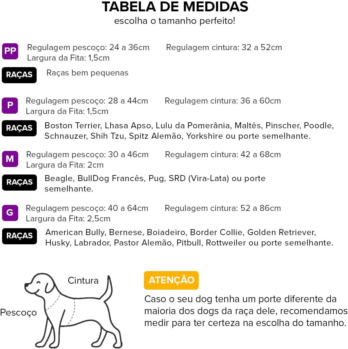 Escolher o tamanho correto é vital para a segurança e o conforto do seu pet. Confira os detalhes abaixo: