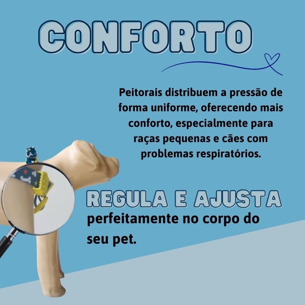 - Design Atraente: Com um visual moderno, o peitoral vai deixar seu cão ainda mais charmoso.