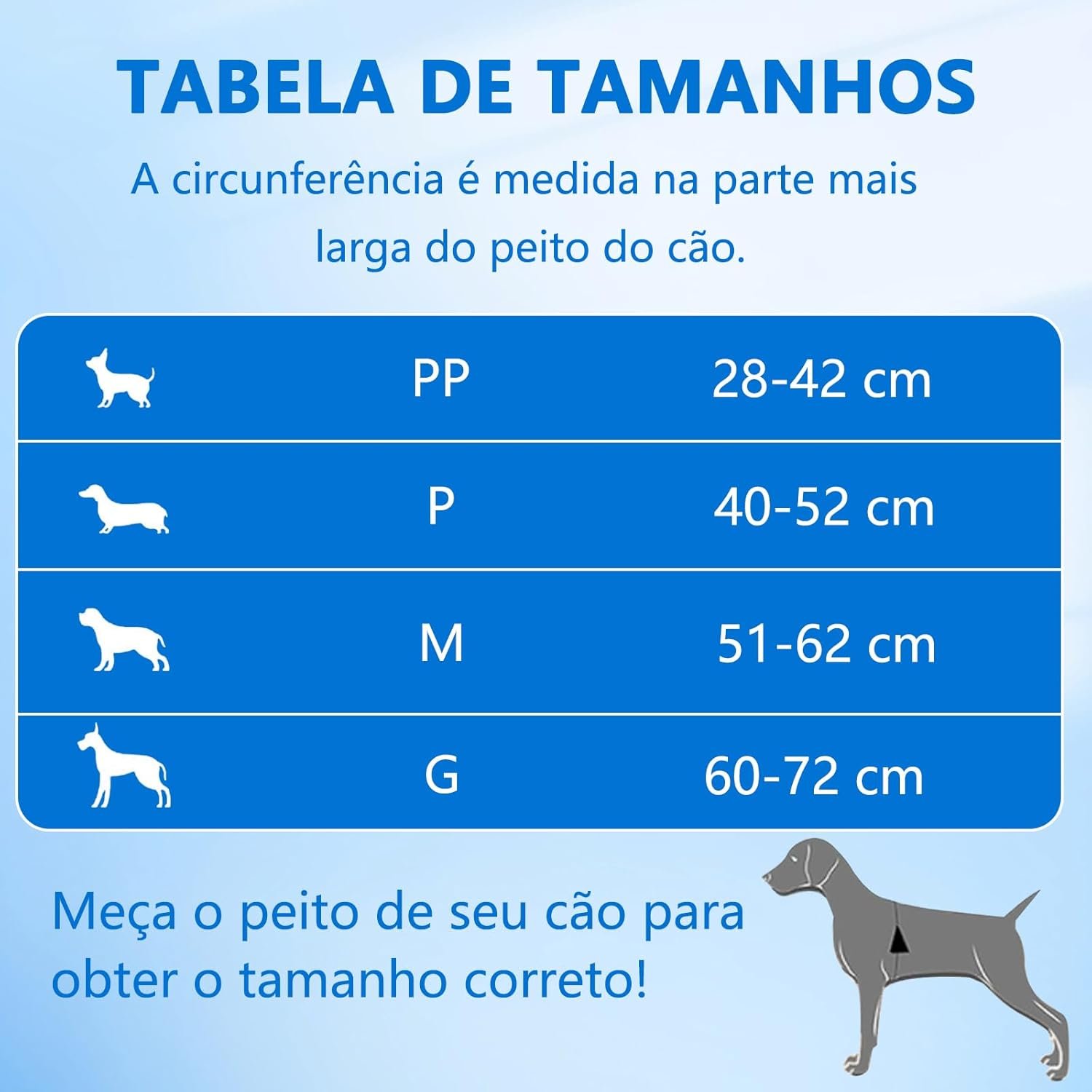 Meça o peito do seu cão e consulte a tabela de tamanhos para um ajuste correto. -