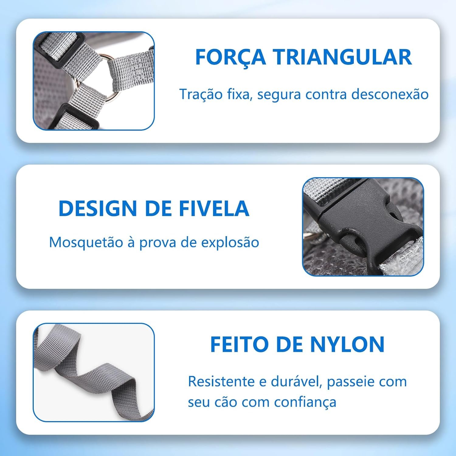 Se você deseja um produto que una conforto, segurança e durabilidade, não deixe de conferir este peitoral azul. O seu melhor amigo merece o melhor!