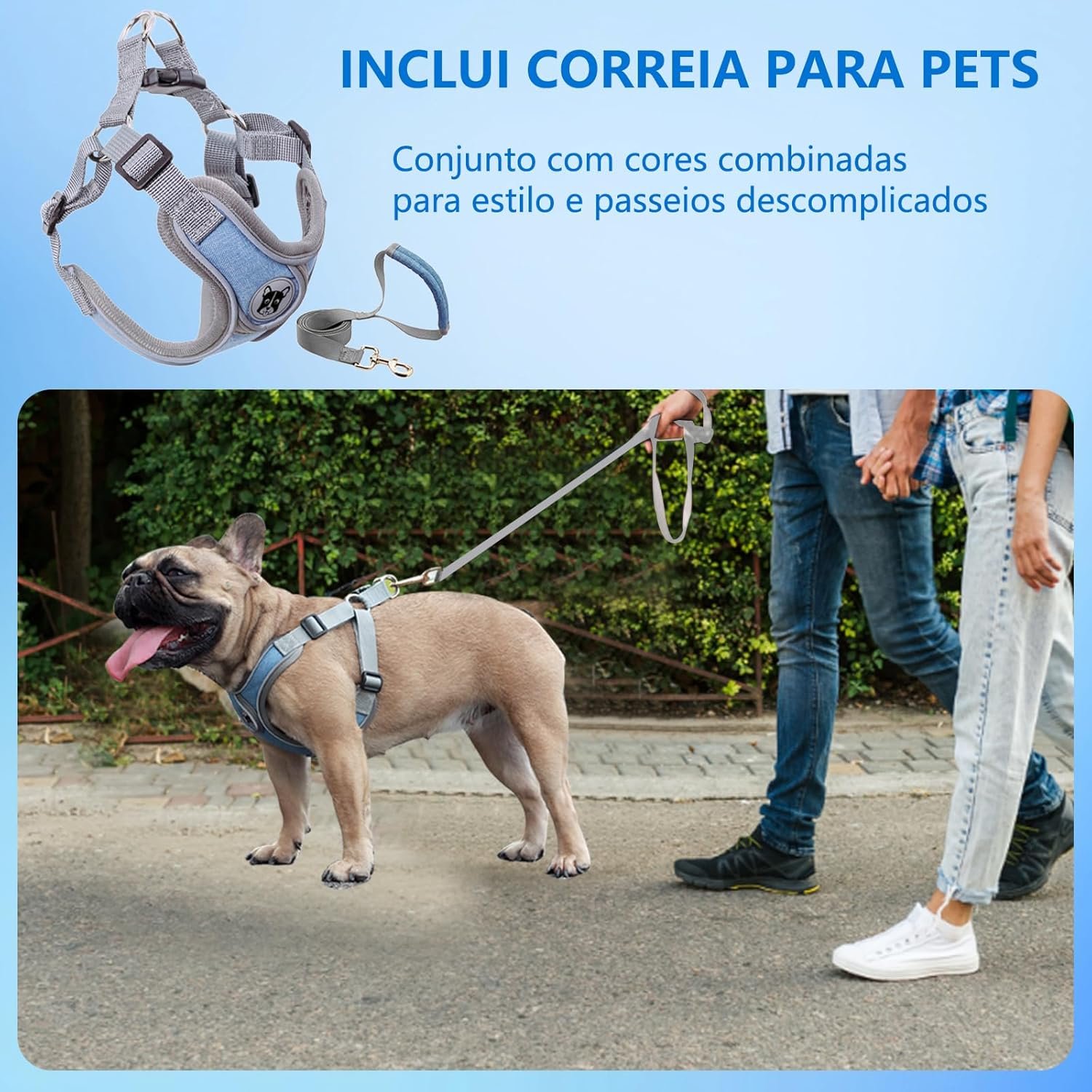 O peitoral azul oferece um conjunto completo para aqueles que amam passear com seus pets. Com um colete ajustável, este peitoral é perfeito para caminhadas, corridas e aventuras ao ar livre, garantindo que seu cão se sinta seguro e confortável.