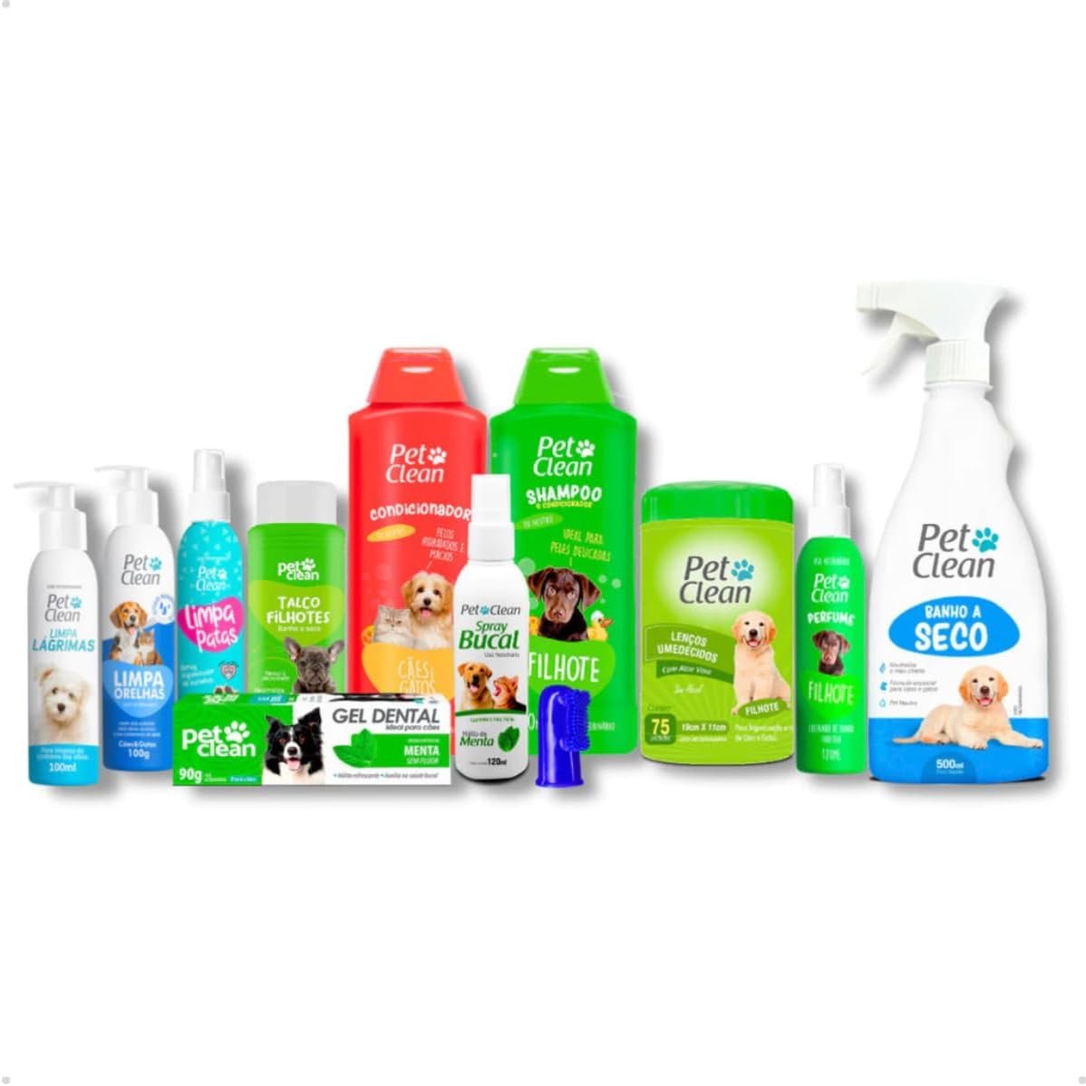 O Kit Higiene e Banho Completo Pet Clean oferece um conjunto de produtos essenciais que atendem às necessidades de higiene de cães e gatos, abrangendo desde filhotes até animais adultos. Veja a lista dos itens incluídos: